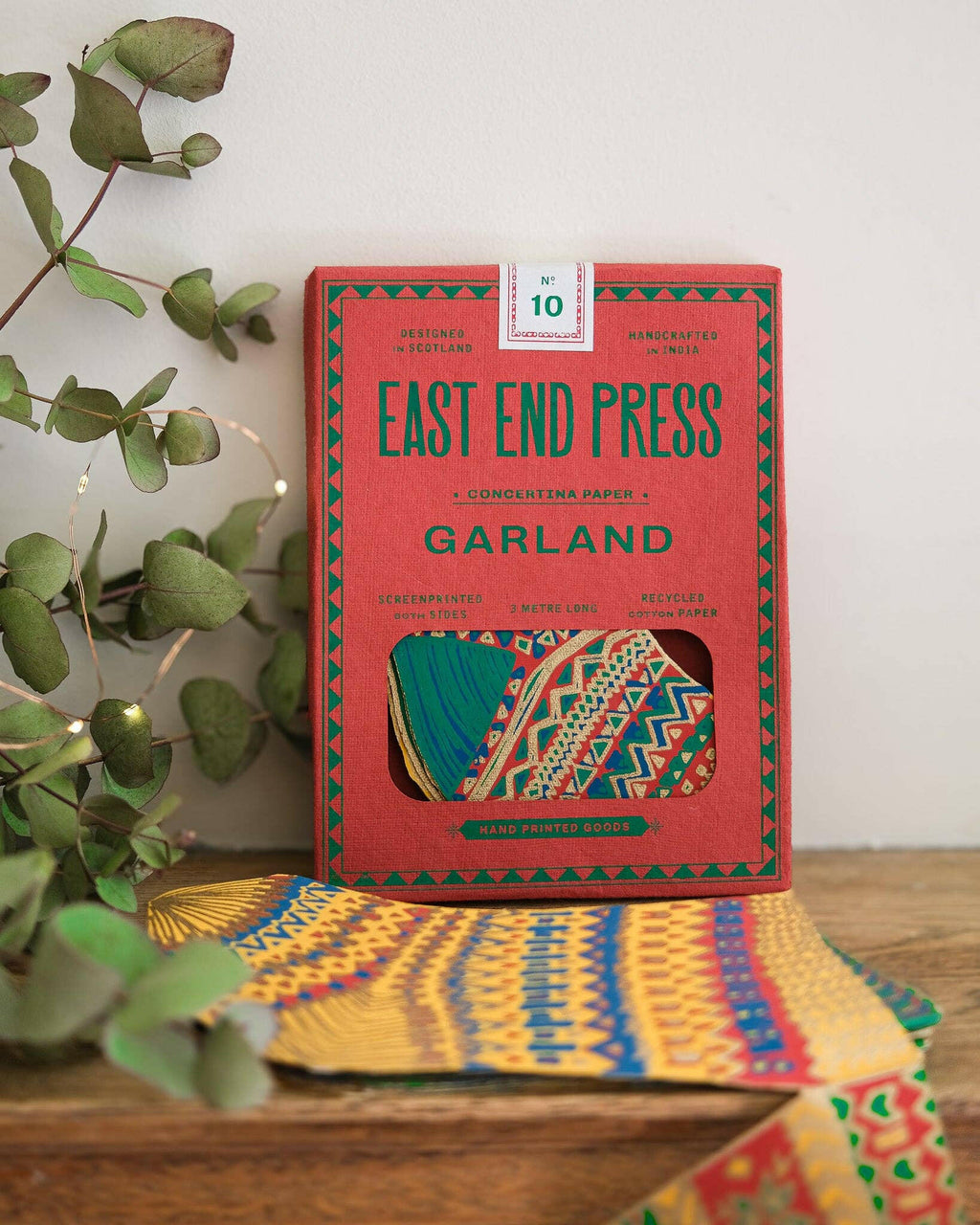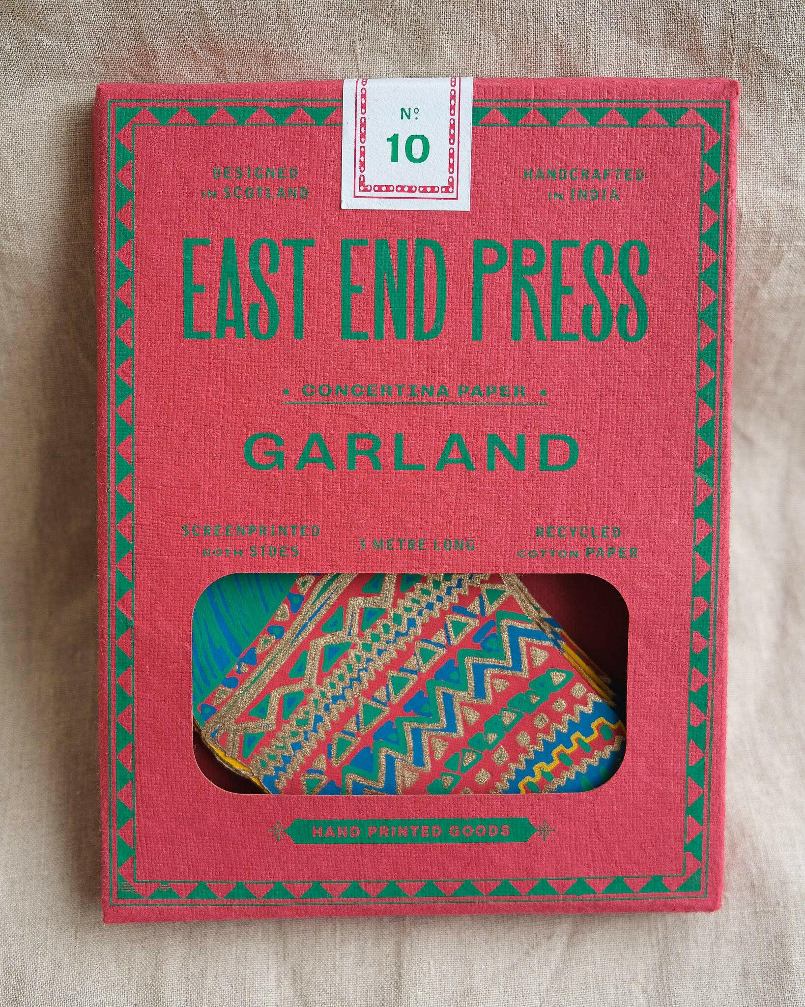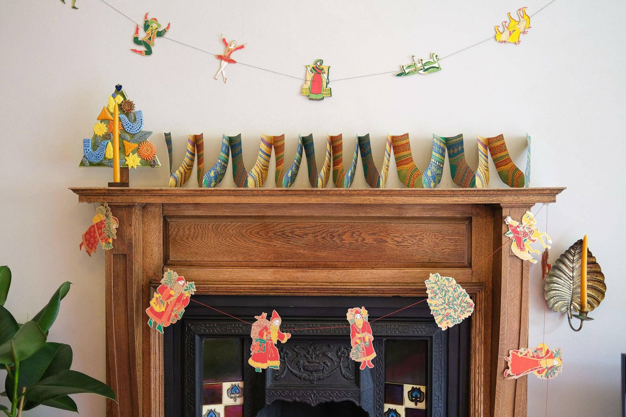 Patterned stockings make up this concertina garland, perfect for decorating a festive mantelpiece or table This garland is hand printed on both sides, and made from thick handmade paper created from entirely recycled content. Minimum order: 6 - 3 metres long - 4 designs repeating over 20 shapes, make up each concertina. - Screen printed by hand on both sides by talented artisans in Jaipur - Sustainably made from recycled materials